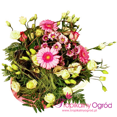 Delikatny bukiet ułożony „na okrągło” przepleciony kratką to wspaniała kwiatowa niespodzianka.Złożony z Eustomy, Róż, Santini i Gerber. Najlepszy na okazję: imieniny, urodziny, ślub, przeprosiny, Dzień Matki i wiele innych… KOD 156