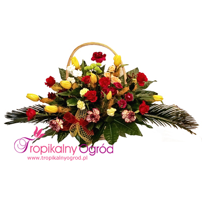Ciepłe słońce i tęcza barw wypływają z kosza pełnego kwiatów. Wspaniały pomysł na prezent. Bukiet złożony z tulipanów, róż i goździków. Najlepszy na okazję: miłość, urodziny, ślub, przeprosiny, Dzień Matki i wiele innych. KOD 126