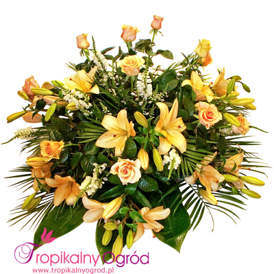 Wiazanka pogrzebowa z herbacianych Margaretek i kremowych Lili. Do wiązanki można dołączyć szarfę z napisem. KOD 165a