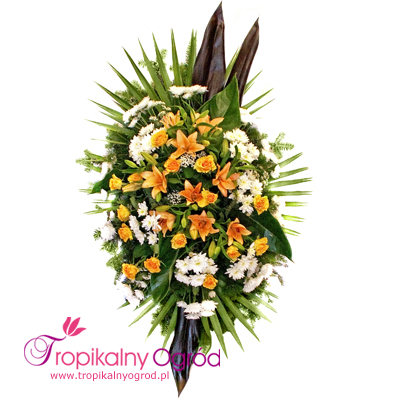 Wieniec pogrzebowy z Lili, Róż i margaretek. Do wieńca można dołączyć szarfę z napisem. KOD 178a