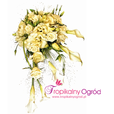 Bukiet ślubny składający się z Cantedeskie Eustomy i Róż. Do bukietu ślubnego przypinka dla Pana Młodego gratis ! *Wiązanka ślubna przedstawiona na zdjęciu, na państwa życzenie może się różnić kolorem lub kwiatami z uwzględnieniem indywidualnych potrzeb Pani Młodej. W celu ustalenia szczegółów prosimy o kontakt telefoniczny, mailowy lub osobiście w kwiaciarni. KOD 031