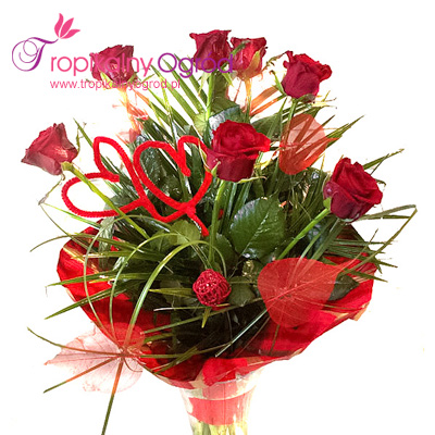 Wiązanka z 7 Róż czerwonych udekorowany serduszkami. Najlepszy na okazję : imieniny, urodziny, przeprosiny, Dzień Matki, podziękowanie i wiele innych … KOD 210