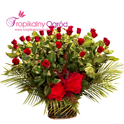 Trzydzieści Róż bordowych w koszu, udekorowane stosowną zielenią. Wysokość Róż w koszu ok.60 cm Najlepszy na okazję: imieniny, urodziny, miłość, podziękowanie i nie tylko.. KOD 168
