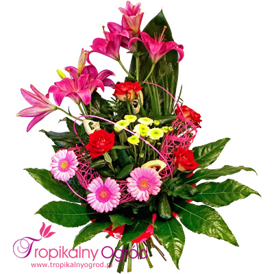 Bukiet składa się z Lili, Gerber i Róż, ozdobiony zielonymi liśćmi. Najlepszy na okazję : imieniny, urodziny, przeprosiny, Dzień Matki, podziękowanie i wiele innych … KOD 182
