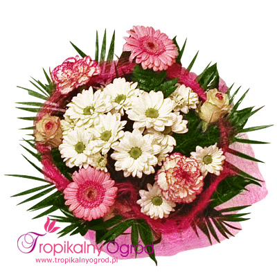 Delikatny bukiet ułożony „na okrągło” to idealny prezent na miła niespodziankę.Złożony z gerber, róż, goździków, margaretek. Najlepszy na okazję: miłość, urodziny,ślub, przeprosiny, Dzień Matki i wiele innych. KOD 127