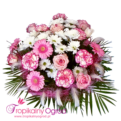 Bukiet urzekający aksamitną delikatnością koloru, złożony z róż, gerber, margaretek, goździków i falujących piórek. Najlepszy na okazję :ślub,miłość, urodziny, przeprosiny, Dzień Matki … KOD 119