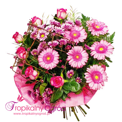 Delikatny bukiet ułożony „na okrągło” przepleciony kratką to wspaniała kwiatowa niespodzianka.Złożony z Róż, Santini i Gerber. Najlepszy na okazję: imieniny, urodziny, ślub, przeprosiny, Dzień Matki i wiele innych… KOD 149