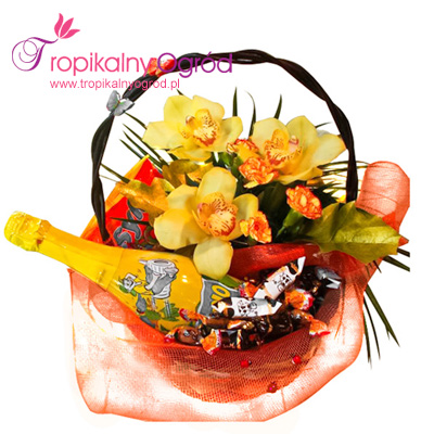 Koszyczek z kwiatami, szampan dla dzieci, słodycze. Do bukietu dołączony jest bilecik z życzeniami. KOD 207