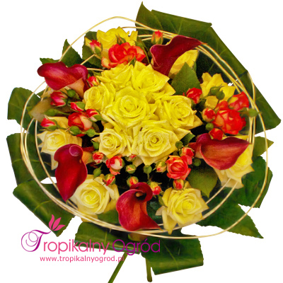 Delikatny bukiet ułożony „na okrągło”, złożony z Cantedeskie, Róż, Róż mini oraz Rattanu, wszystko udekorowane liśćmi. Najlepszy na okazję: miłość, urodziny,ślub, przeprosiny, Dzień Matki i wiele innych. KOD 157