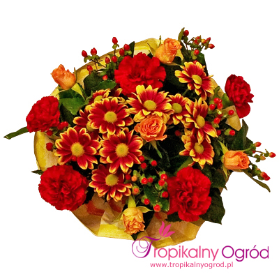 Wiązanka składająca się z róz, margaretek, gożdzików i hiperikum. Najlepszy na okazję : miłość, urodziny,imieniny, przeprosiny, Dzień Matki i wiele innych okazji… KOD 137
